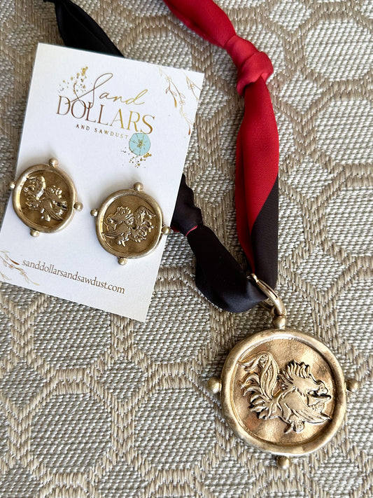 Gamecock Scarf Necklace and Gold Earrings