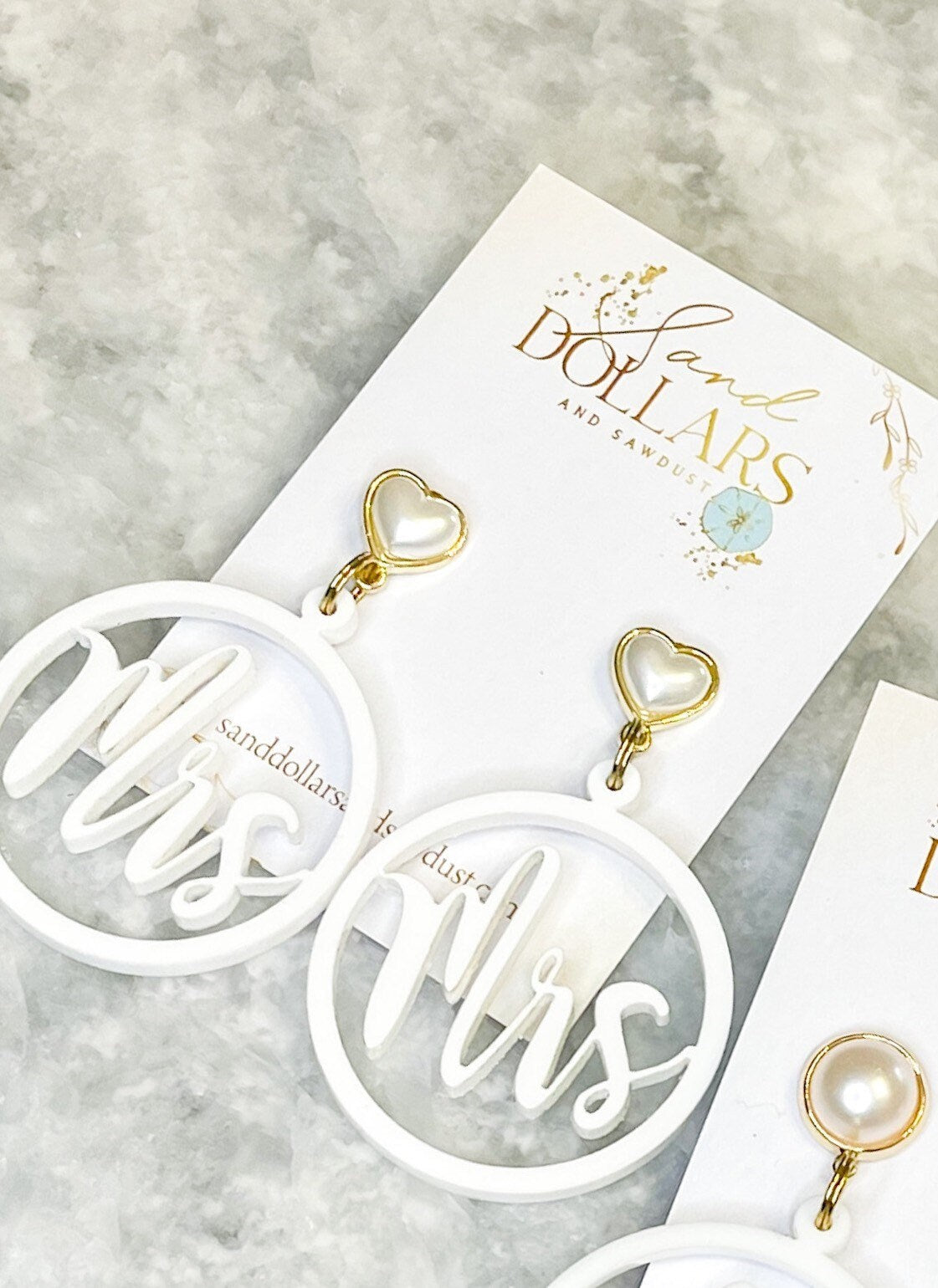 Pair these with your favorite white dress, veil, or jean jacket and let everyone know you're officially off the market! A thoughtful gift for the soon-to-be Mrs., these earrings are a must-have for every bride’s accessory collection.