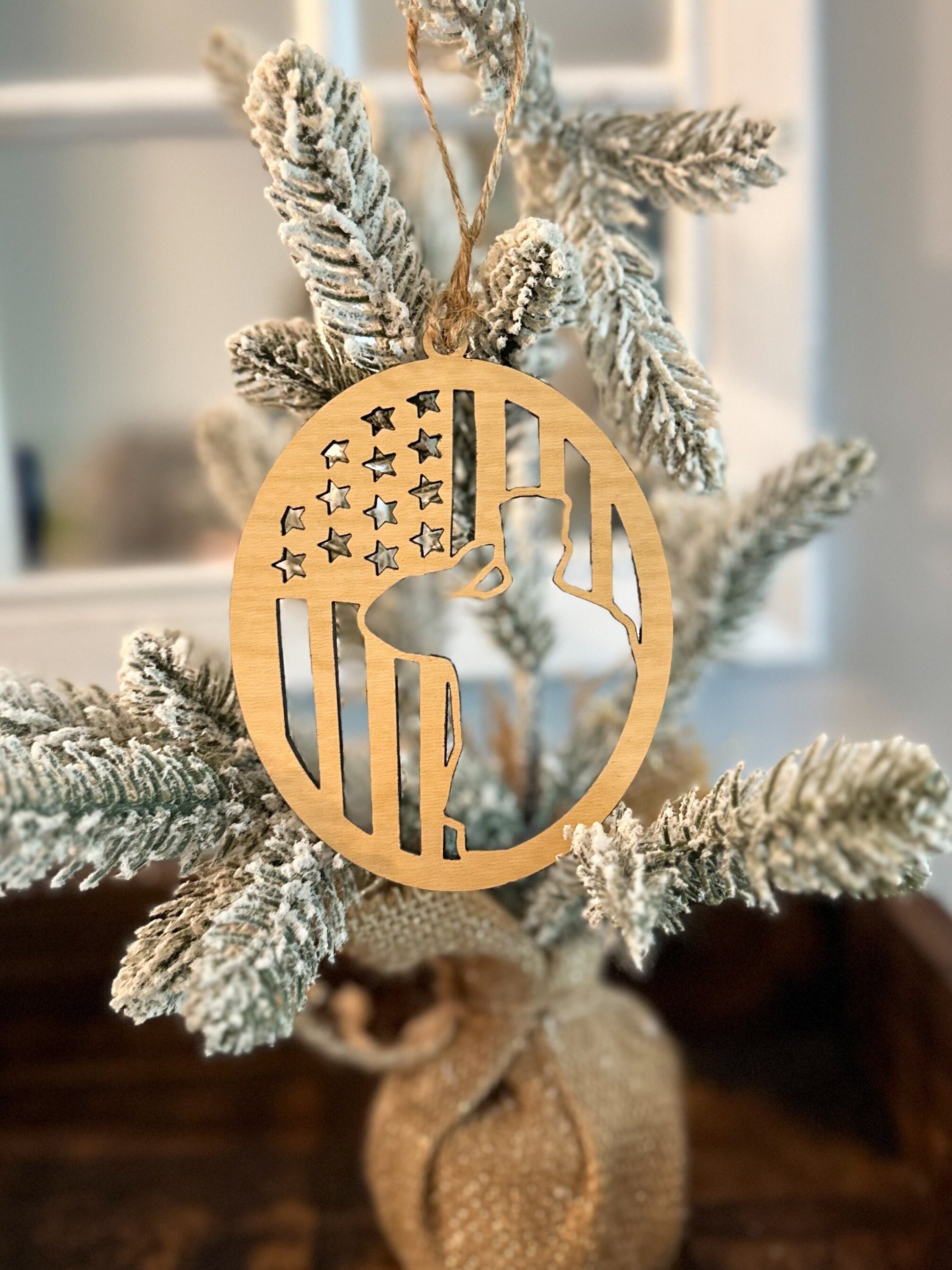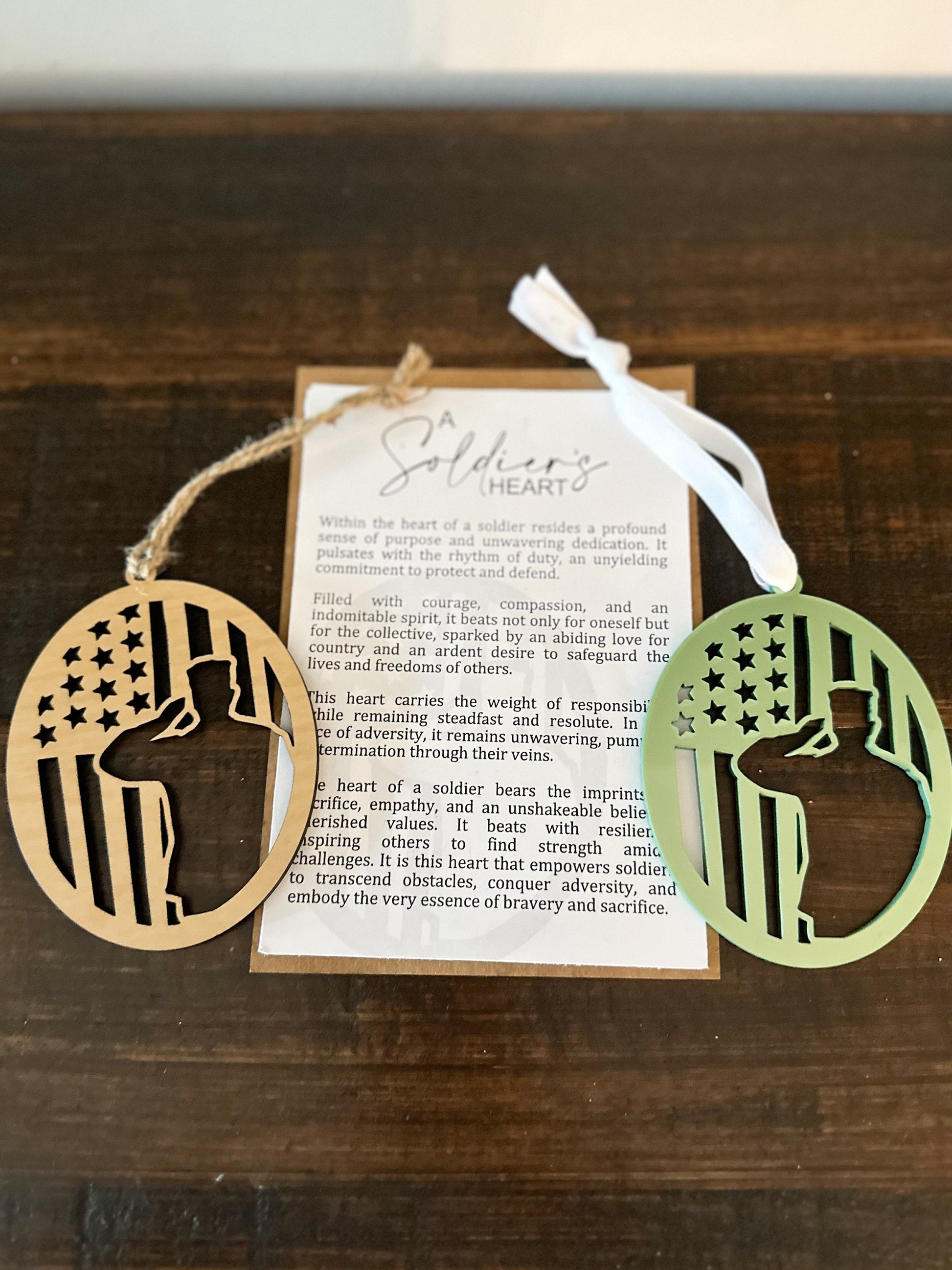 Each ornament features a precision-cut silhouette of a soldier in a proud salute, set against the backdrop of the American flag. The oval frame encases this powerful imagery, offering a clean and elegant presentation. Available in both natural wood and a sleek army green acrylic, you can choose the finish that best fits your style or sentiment.