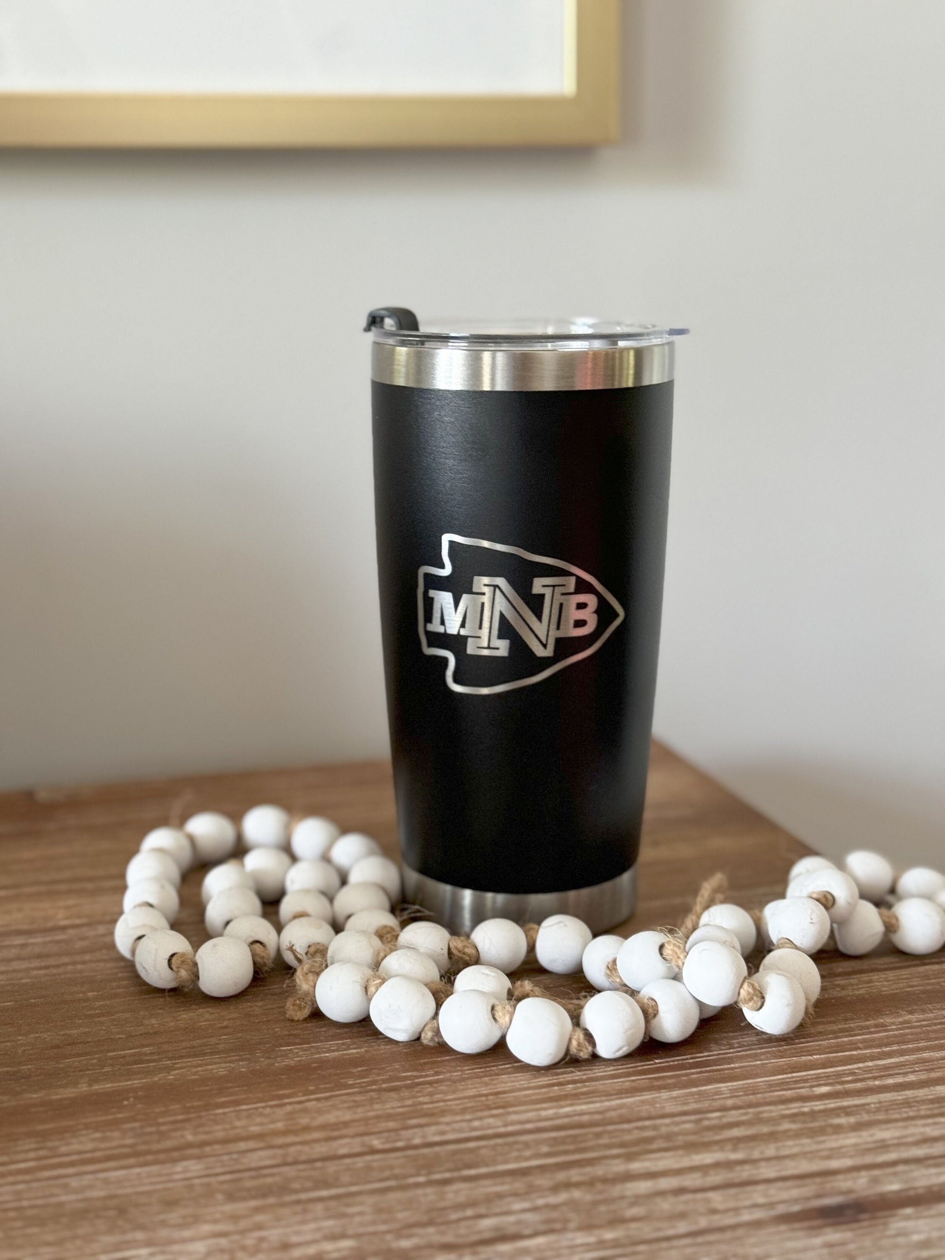 Crafted from premium double-wall stainless steel, this 20oz tumbler keeps drinks cold for up to 24 hours and hot for up to 12—perfect for coffee, water, or your favorite game-day beverage. The matte black powder-coated finish adds a modern edge, while the laser engraving ensures your custom logo won't peel or fade over time.