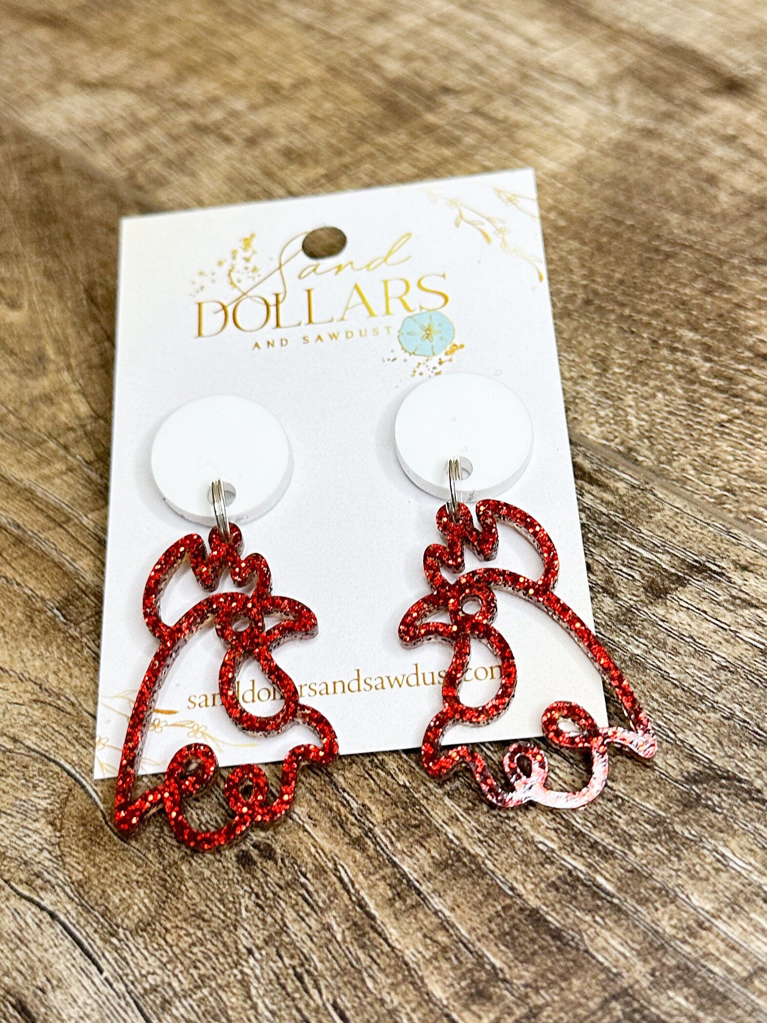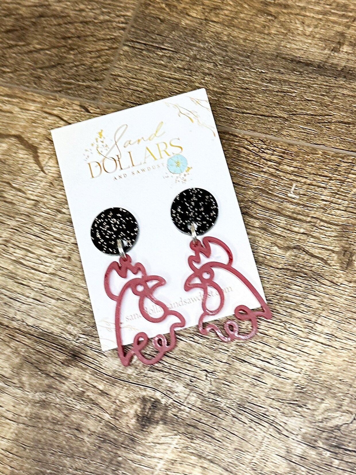 Bring the spirit of the Gamecocks to your ears with our bold and stylish South Carolina Gamecock Gameday Earrings – the perfect accessory for every die-hard fan ready to call the Hogs and cheer on the Garnet and Black! These handmade earrings feature a custom acrylic rooster silhouette with the word “Cocks” seamlessly designed into the shape – a fun and spirited nod to Carolina pride.